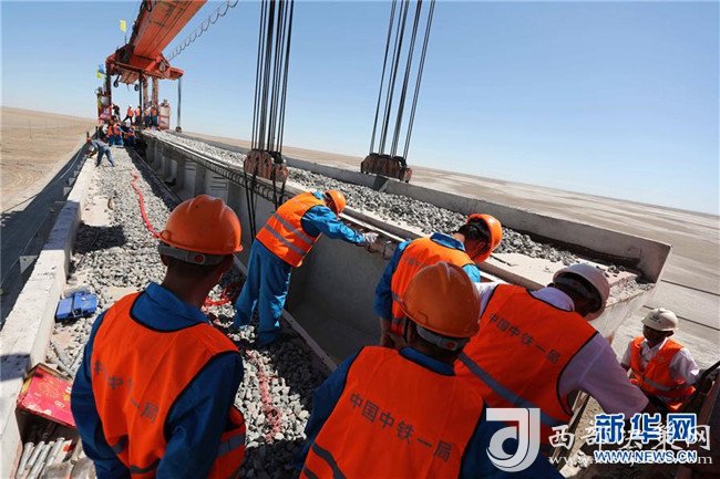 8月17日,在新疆若羌縣,施工人員對合龍后的臺特瑪湖特大橋進(jìn)行最后檢查,確保梁體精準(zhǔn)對位。8月17日11時58分,在一組架橋機(jī)和運梁機(jī)的協(xié)調(diào)配合下,隨著最后一孔T型梁上的梁體精準(zhǔn)吊裝到位,全長24.558公里、歷時2年建設(shè)的格庫鐵路(青海格爾木——新疆庫爾勒)最長鐵路橋——新疆臺特瑪湖特大橋?qū)崿F(xiàn)合龍。新華社發(fā)
