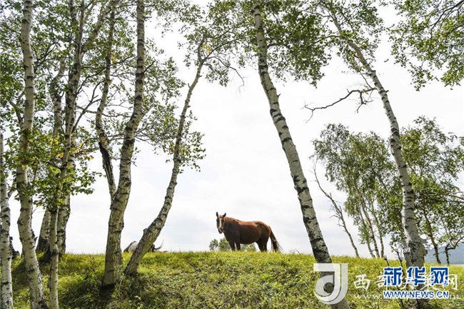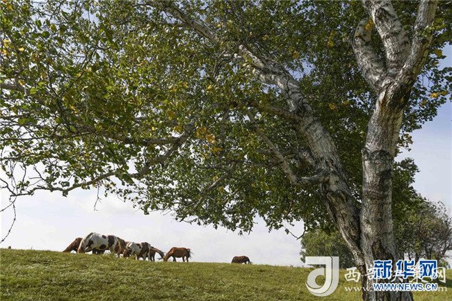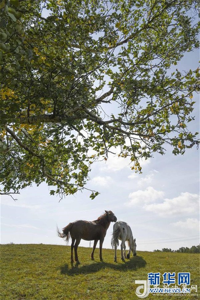 9月1日,兩匹馬在內(nèi)蒙古烏蘭布統(tǒng)草原的樺樹(shù)下吃草。