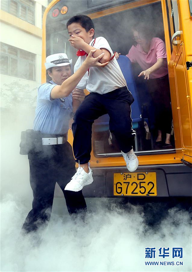 9月3日,民警在校車(chē)應(yīng)急疏散演練環(huán)節(jié)指導(dǎo)小學(xué)生從“起火”的校車(chē)中緊急疏散。
