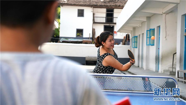 9月4日,陳春英和學(xué)生打乒乓球。  新華社記者胡晨歡 攝