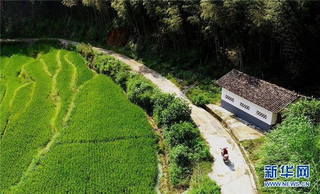 9月4日,陳春英騎摩托車前去領(lǐng)取學(xué)生們的營養(yǎng)餐(無人機(jī)拍攝)。新華社記者胡晨歡 攝