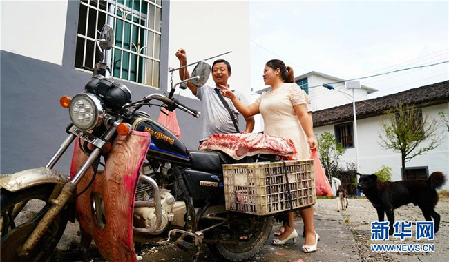 9月4日,陳春英(右)購買豬肉,為學(xué)生們準(zhǔn)備午飯。 新華社記者胡晨歡 攝