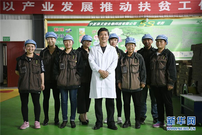 林玉清(左五)與當(dāng)?shù)貑T工合影(8月30日攝)。來(lái)自福建莆田的林玉清2017年3月在西吉縣成立寧夏澤艾堂生物科技有限公司,依托西吉縣優(yōu)質(zhì)的艾草種植條件,采用“公司+合作社+農(nóng)戶”的訂單農(nóng)業(yè)合作模式,與吉強(qiáng)、新?tīng)I(yíng)等鄉(xiāng)鎮(zhèn)種植專(zhuān)業(yè)合作社合作建成艾草種植基地11個(gè)、推廣種植艾草6000畝,為當(dāng)?shù)厝罕娒撠氈赂讳伨托侣纷印P氯A社記者王鵬攝