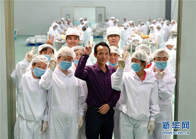 黃玉仁(前排中)在寧夏固原市隆德縣寧夏黃土地農(nóng)業(yè)食品有限公司與當(dāng)?shù)貑T工合影(8月29日攝)。來(lái)自福建莆田的黃玉仁2017年在隆德縣創(chuàng)辦寧夏黃土地農(nóng)業(yè)食品有限公司,利用當(dāng)?shù)伛R鈴薯種植優(yōu)勢(shì),制作馬鈴薯深加工產(chǎn)品,促進(jìn)當(dāng)?shù)伛R鈴薯銷(xiāo)售和農(nóng)民增收。目前公司已建成4條生產(chǎn)線,為當(dāng)?shù)?0多名百姓解決就業(yè)。 新華社記者郭緒雷攝