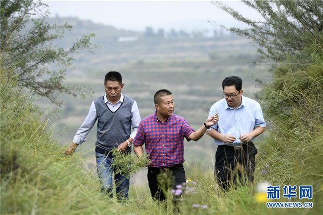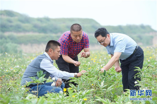 來(lái)自福建長(zhǎng)樂(lè)的林錦云(中)在寧夏固原市河川鄉(xiāng)與福建對(duì)口支援農(nóng)業(yè)專(zhuān)家(右)交流牡丹生長(zhǎng)情況(8月28日攝)。2014年,林錦云通過(guò)土地流轉(zhuǎn)方式,承包了河川鄉(xiāng)1.5萬(wàn)畝荒山,打造油用牡丹生產(chǎn)基地。目前,林錦云種下的7600畝油用牡丹已經(jīng)開(kāi)始產(chǎn)生效益,公司就近吸納村民300多人就業(yè),其中建檔立卡戶39戶,人均年收入2萬(wàn)多元。 新華社記者王鵬攝