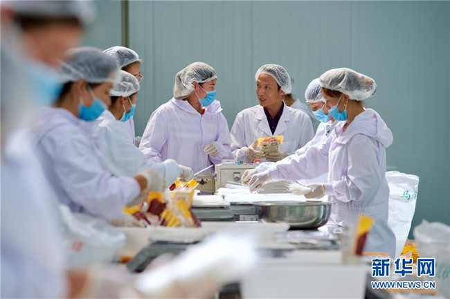 黃玉仁(右三)在寧夏固原市隆德縣寧夏黃土地農(nóng)業(yè)食品有限公司與員工交流馬鈴薯產(chǎn)品包裝注意事項(xiàng)(8月29日攝)。來(lái)自福建莆田的黃玉仁2017年在隆德縣創(chuàng)辦寧夏黃土地農(nóng)業(yè)食品有限公司,利用當(dāng)?shù)伛R鈴薯種植優(yōu)勢(shì),制作馬鈴薯深加工產(chǎn)品,促進(jìn)當(dāng)?shù)伛R鈴薯銷(xiāo)售和農(nóng)民增收。目前公司已建成4條生產(chǎn)線,為當(dāng)?shù)?0多名百姓解決就業(yè)。 新華社記者姜克紅攝