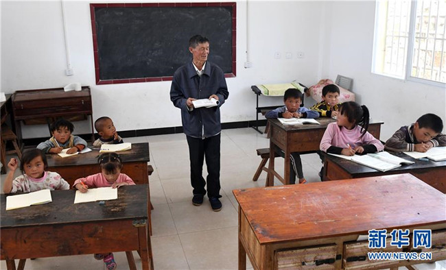 9月5日,云南省祿勸彝族苗族自治縣撒營盤鎮(zhèn)三蒙村阿依羊小學(xué)教師王正祥在給學(xué)生們上課。阿依羊小學(xué)位于海拔2600米的山間,交通不便,全校只有8名學(xué)生。而今年56歲的王正祥既是學(xué)校唯一的老師,也在生活上給了孩子們無微不至的關(guān)心。1980年,王正祥開始從教,在大山深處一干就是38年。他說:“村里就我一個老師,只要有一個學(xué)生,我都要教下去,不讓孩子輟學(xué)。希望他們像小鷹一樣飛出大山,能有更光明的未來。”新華社記者 藺以光 攝
