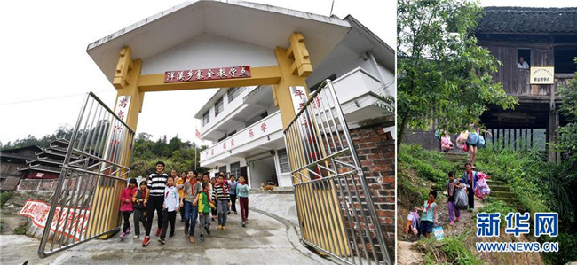 這是一張拼版圖片,左圖為2017年11月17日,廣西三江侗族自治縣洋溪鄉(xiāng)安馬小學(xué)寨全教學(xué)點教師吳周成和學(xué)生們走出學(xué)校;右圖為2014年6月10日,黃開亮在位于吊腳樓里的教學(xué)點目送學(xué)生離校。作為該教學(xué)點的一名老師,黃開亮在這座三面透風(fēng)的吊腳樓里堅守了30年。2014年,師生們搬進(jìn)了三層高的新教學(xué)樓;而黃開亮的學(xué)生、“95后”小伙吳周成也回到學(xué)校,以支教老師的身份傳承老班主任的奉獻(xiàn)精神。新華社發(fā)(黎寒池 攝)