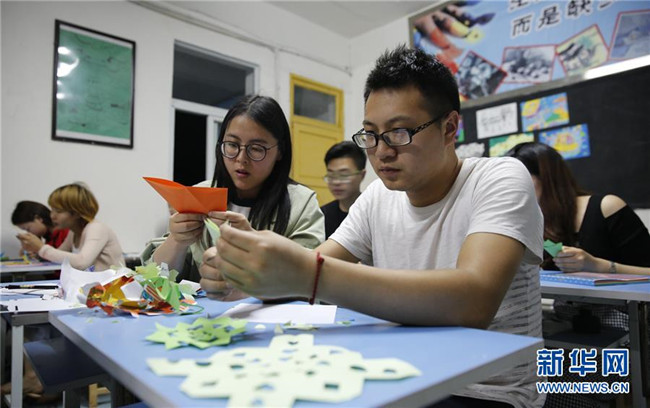 四川省華鎣市慶合初級中學(xué)教師王俊又(右一)與許玉玲在練習(xí)剪紙(4月17日攝)。慶合初級中學(xué)位于華鎣山腳下,由于距離縣城較遠(yuǎn),該校大部分教師長期“以校為家”。