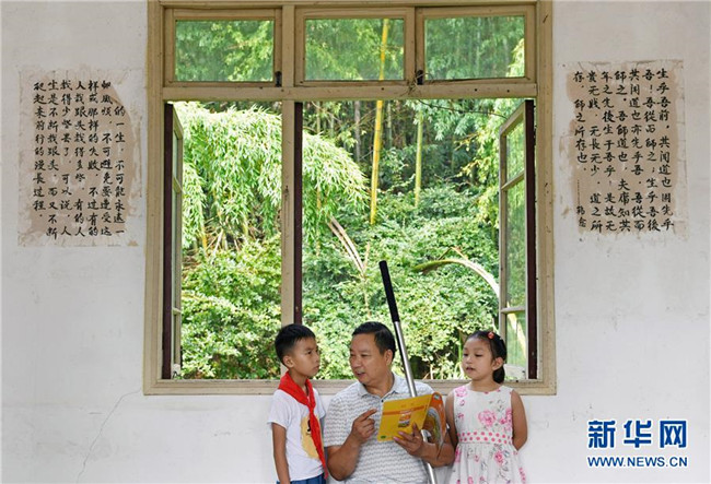 在江西南昌灣里區(qū)立新村立新學(xué)校,鄉(xiāng)村教師高自仁在課間休息時給學(xué)生講解科學(xué)知識(9月3日攝)。因患小兒麻痹左腿行動不便的高自仁1977年高中畢業(yè)后回到老家,在位于梅嶺大山深處的山村里做一名教師。41年來,高自仁拄著拐杖跋涉在崎嶇山路,堅守在三尺講臺,培養(yǎng)了一批又一批學(xué)生,幫助他們走出大山。新華社記者 萬象 攝