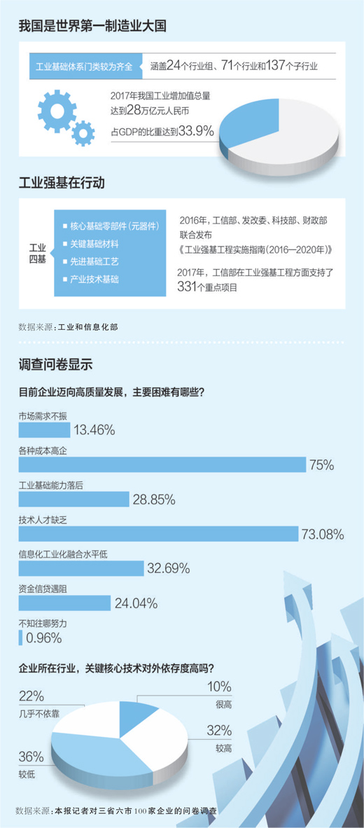 “要實現(xiàn)從‘有’到‘好’的轉(zhuǎn)變,在高端產(chǎn)品上突破,還需要時間。”調(diào)查中企業(yè)坦言,我國部分核心技術(shù)、關(guān)鍵產(chǎn)品和重大裝備仍存瓶頸制約,一些工業(yè)產(chǎn)品在一致性、穩(wěn)定性和使用壽命方面與國外先進(jìn)水平差距較大,工業(yè)基礎(chǔ)須進(jìn)一步夯實。
