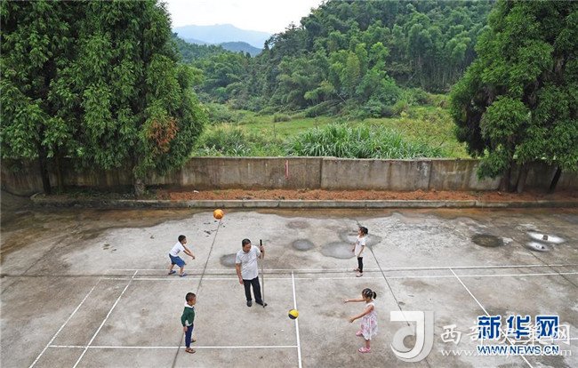 高自仁帶著孩子們?cè)趯W(xué)校的小操場(chǎng)上體育課(9月3日攝)。新華社記者 萬象攝