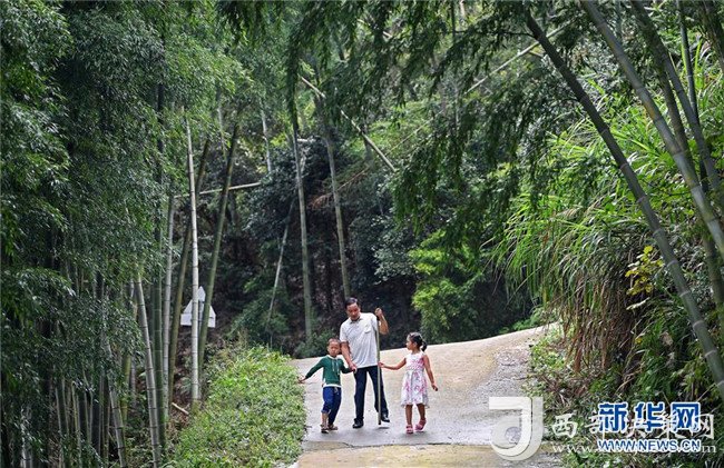 高自仁(中)帶新入學(xué)的新生去學(xué)校附近的竹林參觀,讓孩子們熟悉環(huán)境,了解大自然(9月3日攝)。新華社記者 萬象攝