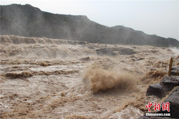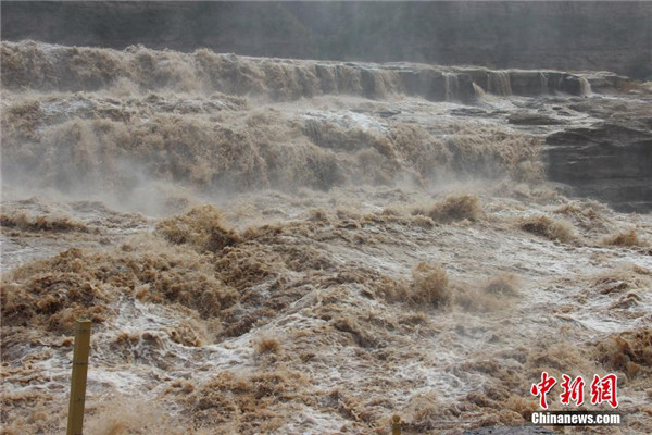 近日,黃河壺口瀑布水量大增,湍急的水流攜帶大量的泥沙奔涌而下,主瀑布幾乎沒有落差,出現(xiàn)“水岸齊平”的景象。 阿琳娜 攝