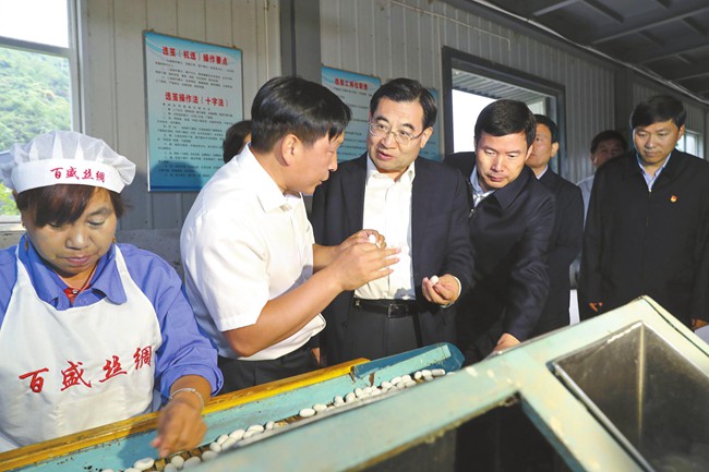 鎮(zhèn)安縣是深度貧困縣,自然條件差,貧困人口多,脫貧難度大。胡和平首先來到永樂街道辦事處中合村永田農(nóng)業(yè)發(fā)展公司,實地調(diào)研食用菌產(chǎn)供銷一體化脫貧項目,詳細了解產(chǎn)品生產(chǎn)工藝和銷售情況,鼓勵企業(yè)擴大生產(chǎn)規(guī)模,提升品牌價值,做大海外市場,在提高效益的同時增強帶動群眾增收能力。在百盛繅絲廠,胡和平聽取公司生產(chǎn)經(jīng)營和脫貧幫扶情況介紹,了解選繭、煮繭、繅絲、復整等生產(chǎn)流程,并與前來出售蠶繭的農(nóng)民張秀成交談。當聽說張秀成今年養(yǎng)繭收入6000多元,胡和平十分高興。他希望企業(yè)依托商洛青山綠水,發(fā)展綠色產(chǎn)業(yè),延長產(chǎn)業(yè)鏈條,帶動更多群眾擺脫貧困。