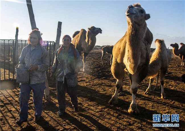 合作社工作人員在駝場里忙碌(9月14日攝)。 新華社記者 趙戈 攝