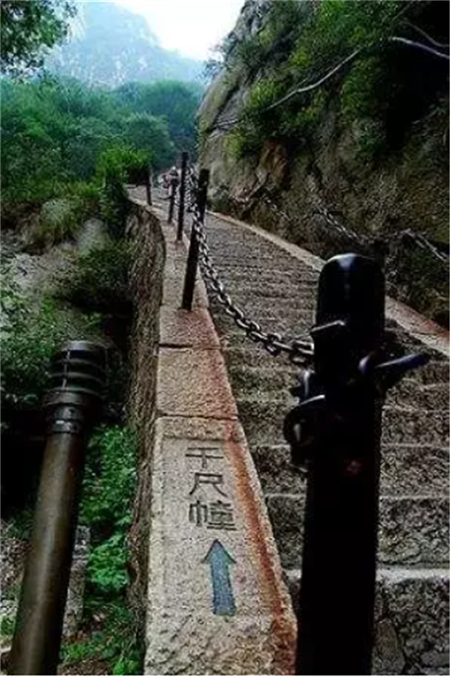 千尺幢是登華山的一段著名的險(xiǎn)道,開鑿在懸崖峭壁上,直立千仞,氣象森然,被許多人視為畏途。像千尺幢這樣的登山道路,只有華山才有,華山也因?yàn)橛辛诉@樣的路才有了“奇”“險(xiǎn)”的景色,奇與險(xiǎn)成為華山特別突出的景觀特色。其它山岳也有險(xiǎn)境,但都被掩埋在了雄或者秀等特色中,不像華山的險(xiǎn)這般令人驚心動(dòng)魄,這般讓人心潮澎湃。