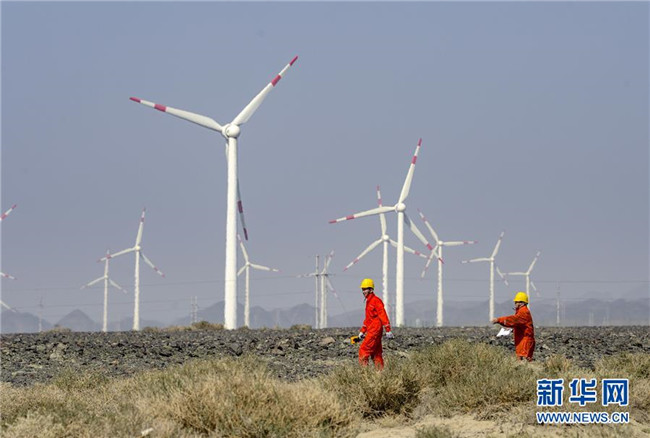 在烏魯木齊近郊的達(dá)坂城風(fēng)力發(fā)電場(chǎng),兩位工作人員在巡檢風(fēng)力發(fā)電設(shè)備(9月18日攝)。
