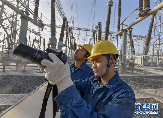 在吐魯番市750千伏變電站,兩位工作人員利用專用設(shè)備對(duì)電力設(shè)施進(jìn)行檢查(9月18日攝)。記者趙戈 攝