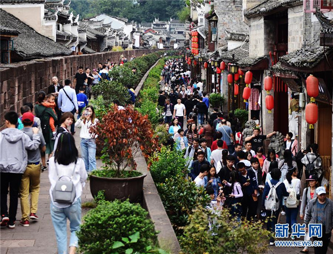 游客在湖南湘西土家族苗族自治州鳳凰古城游覽(10月3日攝)。新華社發(fā)(姚方 攝)