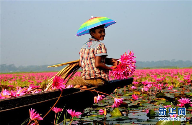 10月7日,在孟加拉國巴里薩爾地區(qū),一名兒童在采摘睡蓮。 近日,孟加拉國巴里薩爾地區(qū)的睡蓮進入盛開時節(jié)。 新華社發(fā)(薩利姆·禮薩 攝)