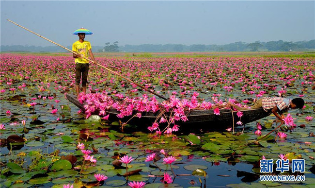 10月7日,在孟加拉國巴里薩爾地區(qū),當(dāng)?shù)鼐用裨诓烧彙?近日,孟加拉國巴里薩爾地區(qū)的睡蓮進入盛開時節(jié)。 新華社發(fā)(薩利姆·禮薩 攝)