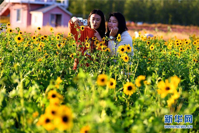 10月9日,在河北省石家莊市滹沱河畔的森林河趣那公園內(nèi),游客在花田觀賞游覽。新華社發(fā)(陳其保 攝)