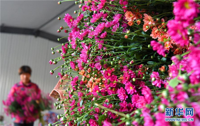10月9日,在山東省淄博市沂源縣石橋鎮(zhèn)一花卉種植基地,工人在搬運(yùn)采摘的多頭菊。 新華社發(fā)(趙東山 攝)