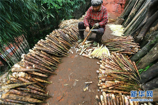 10月14日,在貴州赤水市寶源鄉(xiāng)聯(lián)華村,竹農(nóng)加工剛?cè)さ孽r筍。金秋時(shí)節(jié),貴州省赤水市寶源、兩河口、丙安等鄉(xiāng)鎮(zhèn)種植的5萬余畝大竹筍迎來收獲季。當(dāng)?shù)刂褶r(nóng)加緊采挖竹筍,進(jìn)行加工后外銷。素有“中國(guó)竹子之鄉(xiāng)”的赤水市,現(xiàn)有竹林面積132.8萬畝。竹產(chǎn)業(yè)已經(jīng)成為當(dāng)?shù)孛撠氃鍪盏闹饕乐弧?(王長(zhǎng)育 攝)