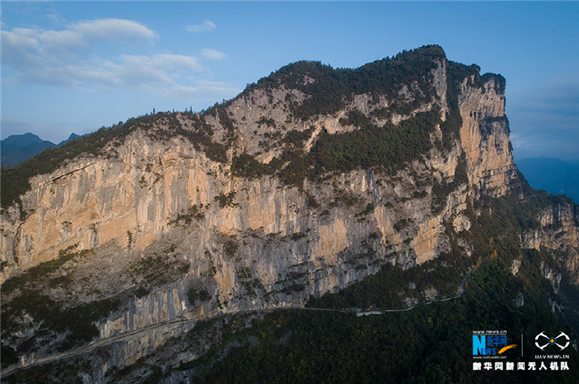 在重慶市開(kāi)州區(qū)滿(mǎn)月鄉(xiāng)雙坪村,一段595米的鄉(xiāng)村公路頗為特殊,被稱(chēng)為“懸崖天路”。新華網(wǎng) 李相博 攝