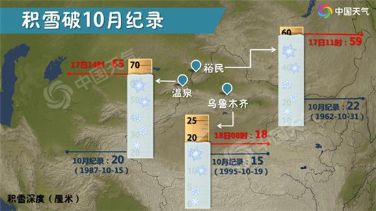受強(qiáng)冷空氣影響,17日新疆伊犁河谷平原地區(qū)出現(xiàn)近28年以來(lái)最早大范圍初雪,首府烏魯木齊也降下今年下半年的初雪,較常年初雪日10月23日(1981-2010年)略早。昨天早晨降雪持續(xù),8時(shí)烏魯木齊積雪已經(jīng)達(dá)到18厘米,打破了當(dāng)?shù)?0月份的積雪紀(jì)錄,并且最低氣溫首度“破冰”只有-1℃。受其影響嗎,新疆暴雪、大風(fēng)、寒潮、霜凍、道路結(jié)冰、沙塵暴6個(gè)預(yù)警齊發(fā),惡劣天氣為農(nóng)牧業(yè)生產(chǎn)、林果業(yè)、交通旅游、城市運(yùn)行等帶來(lái)了不利影響。