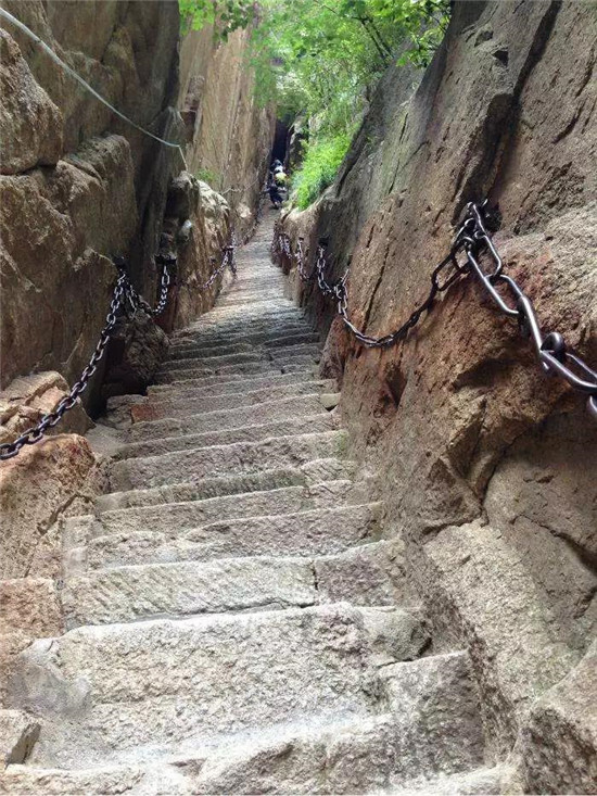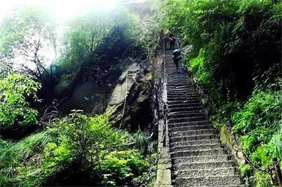 一是直上云頭。如千尺幢、上天梯、否梯、百尺峽等,開鑿于石隙崖壁,直上直下,有聳入云天之勢(shì);二是凌空載道。一邊臨壁,一邊凌空,奇絕險(xiǎn)要。如南峰長空棧道、北峰至蒼龍嶺棧道;