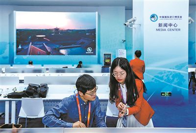 11月4日,首屆中國(guó)國(guó)際進(jìn)口博覽會(huì)進(jìn)入1天倒計(jì)時(shí)。來(lái)自復(fù)旦大學(xué)、上海交通大學(xué)等34所上海高校的5200多名大學(xué)生志愿者,成為進(jìn)博會(huì)志愿者隊(duì)伍的主力軍。圖為進(jìn)博會(huì)新聞中心的東華大學(xué)志愿者(右)在為記者解答問(wèn)題。 張勁松 攝
