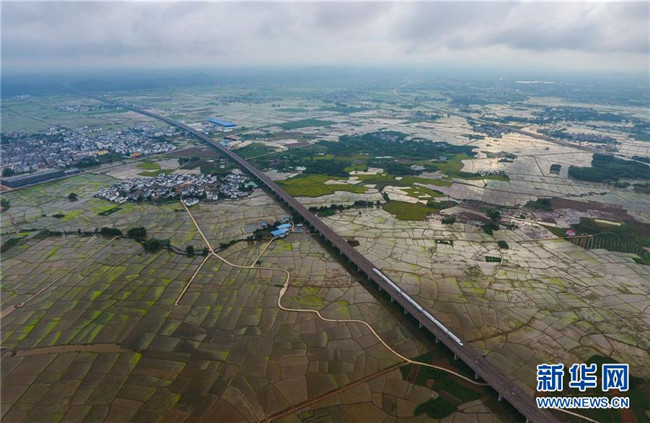 這是廣西南寧動車所內(nèi)準(zhǔn)備發(fā)往各地的動車組列車(7月1日無人機拍攝)。