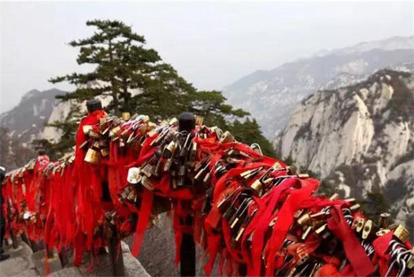 金鎖關(guān)北接五云峰,南控華山主峰,東西兩側(cè)壑深千丈,關(guān)前僅有一米完的臺階石徑。環(huán)周古松蒼翠,奇石林立,常有祥云環(huán)繞,風(fēng)光非常迤麗。“但有女兒初長成,便為三秦姣姣容。”說的就是奇險天下第一山的華山除了以其奇、險、秀而聞名遐邇之外,還別有一番令人動容的金鎖關(guān)風(fēng)景:關(guān)內(nèi)、關(guān)外登山路兩側(cè)的鐵索上,情侶鎖、平安鎖,重重疊疊,紅繩彩線迎風(fēng)搖曳,筑成一道美麗的愛情風(fēng)景線,鎖住對愛情的誓言,表達(dá)堅如磐石的愛情忠貞!