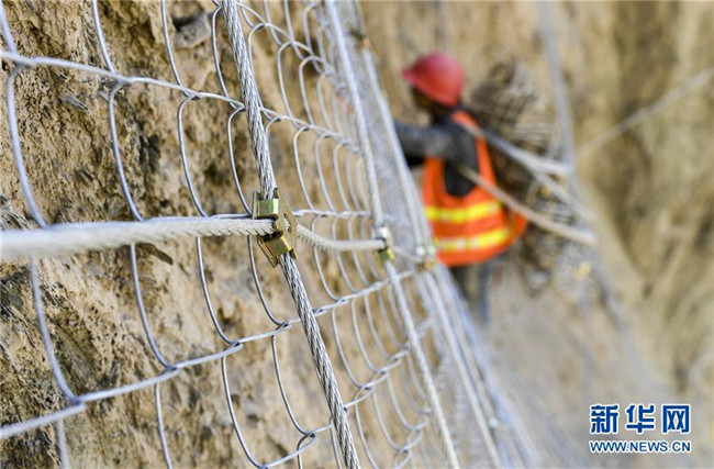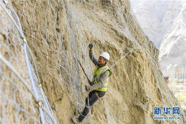 11月12日,在新疆塔什庫爾干塔吉克自治縣大同鄉(xiāng)鄉(xiāng)政府附近的一處路段,來自四川的吳飛在峭壁上安裝防護(hù)網(wǎng)。 近日,一支由四川、云南等地工人組成的施工隊(duì)忙碌在帕米爾高原深處的大山中,為塔什庫爾干塔吉克自治縣縣城至大同鄉(xiāng)道路的易落石路段安裝防護(hù)網(wǎng)。崇山峻嶺間,工人要攀爬至峭壁上施工作業(yè),如躍動(dòng)在大山間的“舞者”。據(jù)介紹,這支施工隊(duì)常年活躍在新疆山區(qū)道路的施工現(xiàn)場(chǎng),為風(fēng)險(xiǎn)路段加裝安全防護(hù)裝置,保障過往車輛和沿途村民出行安全。 新華社記者 胡虎虎 攝