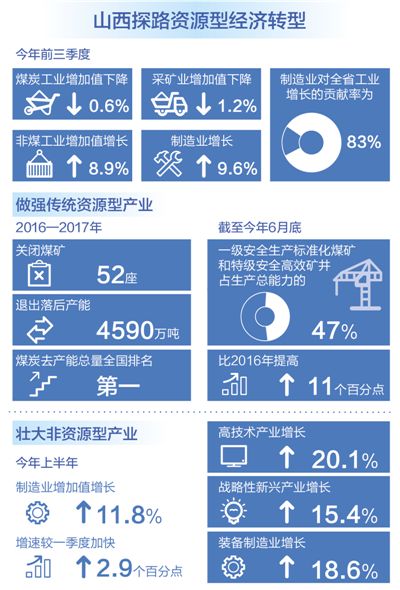 2017年,山西煤焦冶電傳統(tǒng)產(chǎn)業(yè)投資下降9.8%,而非傳統(tǒng)產(chǎn)業(yè)投資增長了22.9%;今年一季度采礦業(yè)投資下降6個百分點,而制造業(yè)、高新技術(shù)產(chǎn)業(yè)投資分別增長12.7%、17.2%。