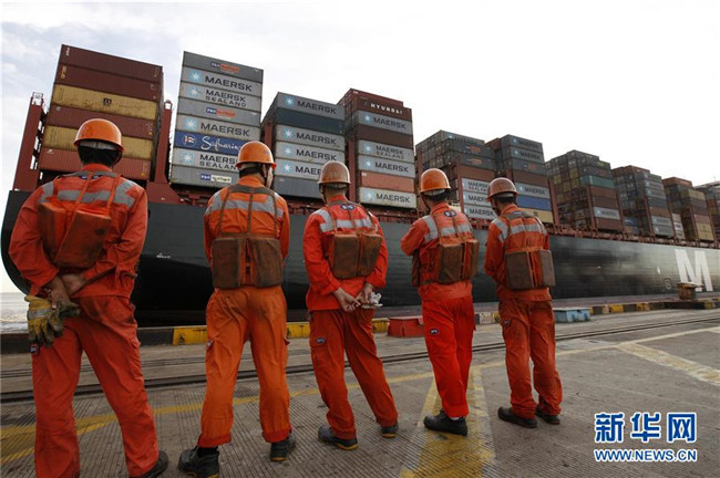 幾名工人在洋山深水港碼頭上等待一艘集裝箱船駛?cè)氩次唬?017年9月13日攝)。新華社記者方喆攝