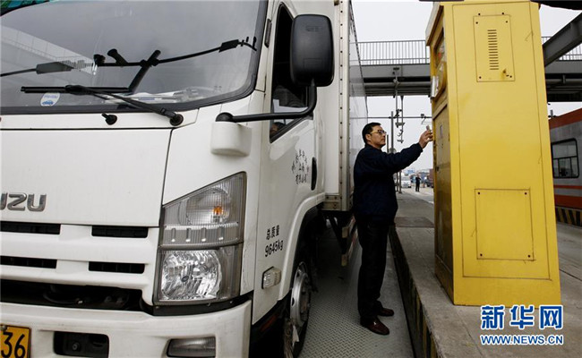 一名卡車司機在上海外高橋的自貿(mào)區(qū)車輛出入口掃描手機二維碼完成通關(guān)手續(xù)(2017年1月10日攝)。新華社記者方喆攝