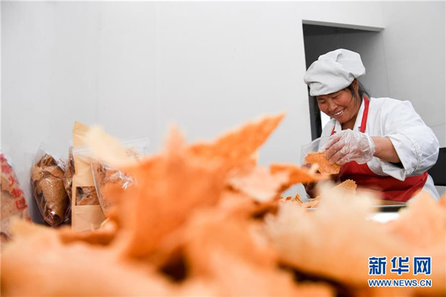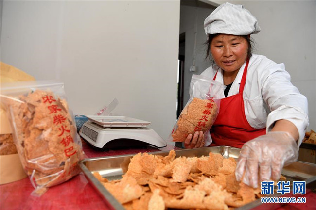 11月22日,姚新花在鍋巴廠里包裝鍋巴。 新華社記者 徐亮攝