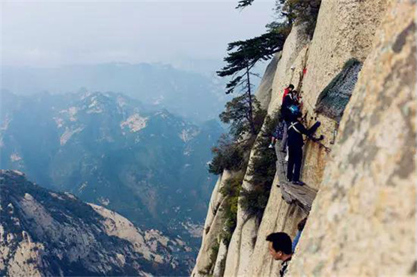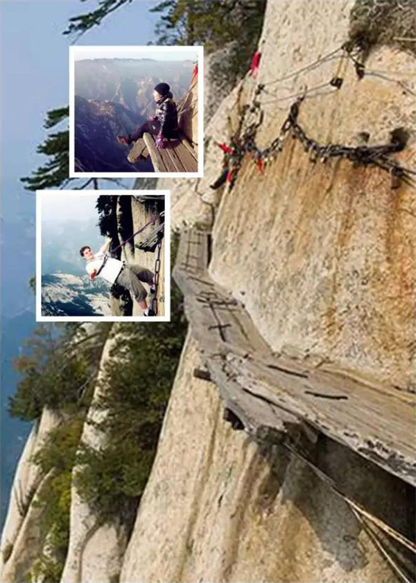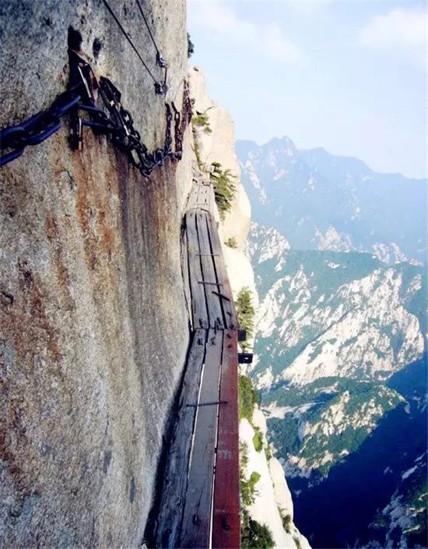 西岳華山歷來被認(rèn)為是五岳之中最為險峻的,而在華山中,險中之險莫過于“長空棧道”和“鷂子翻身”。特別是具有700多年歷史的長空棧道,在華山南峰東側(cè)山腰的萬仞絕壁上鑿出來的幾個踏腳之處,鑲嵌石釘搭木椽搭建了一個百余米懸空的棧道,讓人望而卻步,如果你有恐高癥,僅僅看一眼都會讓你驚恐萬分。2013年,著名旅游網(wǎng)站“Smarter Travel”盤點(diǎn)全球最恐怖懸崖步道,將華山長空棧道列為全球十大最恐怖的懸崖步道之一。
