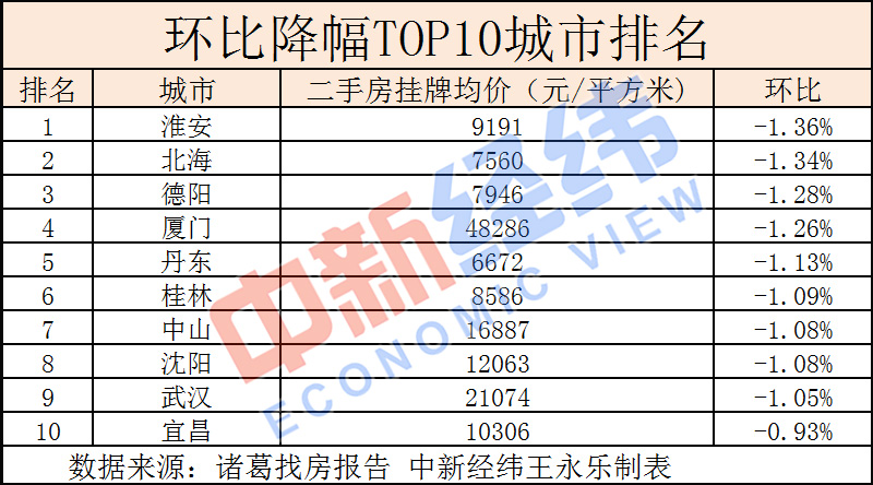 數據顯示,淮安(-1.36%)、北海(-1.34%)、德陽(-1.28%)、廈門(-1.26%)、丹東(-1.13%)、桂林(-1.09%)、中山(-1.08%)、沈陽(-1.08%)、武漢(-1.05%)、宜昌(-0.93%)為環(huán)比跌幅TOP10城市。