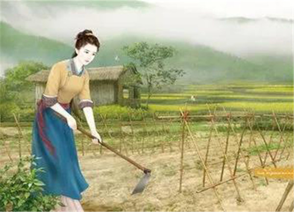 有一天,太陽(yáng)從東方升起,不遠(yuǎn)處的華山峰頂上便披上了一層金色的彩虹。羅敷早早就起來(lái)打扮自己,發(fā)髻微微盤(pán)起在側(cè),耳戴明月耳環(huán),身著紅色短襖,淺黃色花紋羅裙,收拾停當(dāng),帶上采桑的工具,高高興興地出門(mén),往峪田里走去。羅敷邊走邊想,王可一定在等著她,商量終身大事呢。