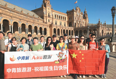 今年國慶黃金周,中國游客在西班牙祝福祖國。中青旅供圖 |