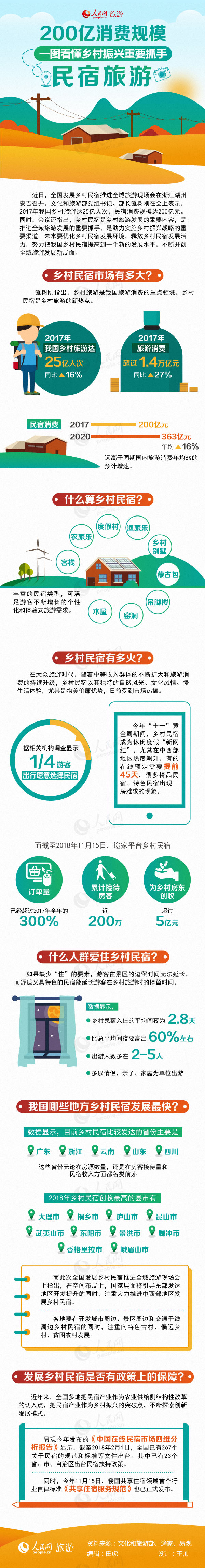 近日,全國(guó)發(fā)展鄉(xiāng)村民宿推進(jìn)全域旅游現(xiàn)場(chǎng)會(huì)在浙江湖州安吉召開(kāi)。文化和旅游部黨組書(shū)記、部長(zhǎng)雒樹(shù)剛在會(huì)上表示,2017年我國(guó)鄉(xiāng)村旅游達(dá)25億人次,民宿消費(fèi)規(guī)模達(dá)200億元。同時(shí),會(huì)議還指出,鄉(xiāng)村民宿是鄉(xiāng)村旅游發(fā)展的重要內(nèi)容,是助力實(shí)施鄉(xiāng)村振興戰(zhàn)略的重要渠道,未來(lái)要優(yōu)化鄉(xiāng)村民宿發(fā)展環(huán)境,不斷開(kāi)創(chuàng)全域旅游發(fā)展新局面。如此大的規(guī)模,鄉(xiāng)村民宿到底是什么?哪些地區(qū)鄉(xiāng)村民宿最火?什么人群愿為鄉(xiāng)村民宿買單?一張圖帶你讀懂鄉(xiāng)村民宿!(田虎)