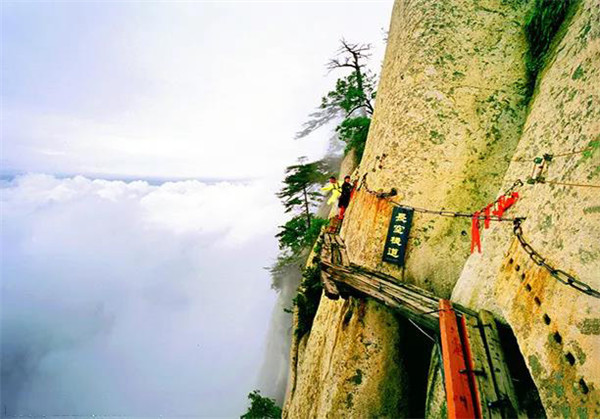 長空棧道位于南天門外,是華山著名險道之首。棧道分三段:南天門石坊至朝元洞西,路依崖鑿出,長20米,寬二尺許,為上段。折而下,崖隙橫貫鐵棍,形如凌空懸梯,游人須挽索逐級而下,稱之“雞下架”,是為中段。再西折為下段,筑路者在峭壁上鑿出石孔,楔進(jìn)石樁,石樁之間架木椽三根,游人至此,須面壁貼腹,腳踏木椽橫向移動前行。