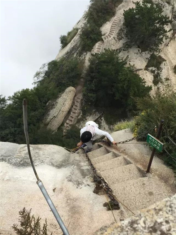 千尺幢位于回心石之上,是華山第一險境。山幢壁直立,其間僅容二人上下穿行。兩邊鐵鏈垂直下垂,坡度為70°。從上到下共有370多個臺階,皆不滿足寬。