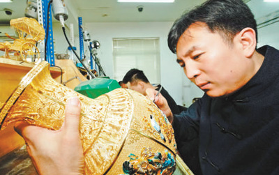 圖為獲得“北京大工匠”稱號的工藝美術(shù)大師陳令勇在進行花絲鑲嵌。本報記者賀勇攝