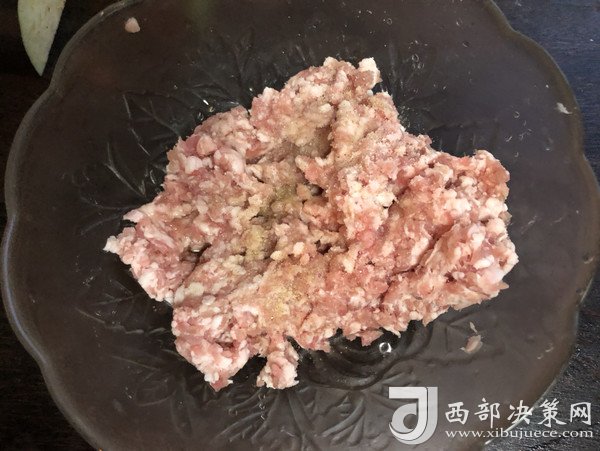 1.豬肉泥放入盆中,加入料酒、鹽、生抽、白胡椒粉、姜汁和雞粉拌勻