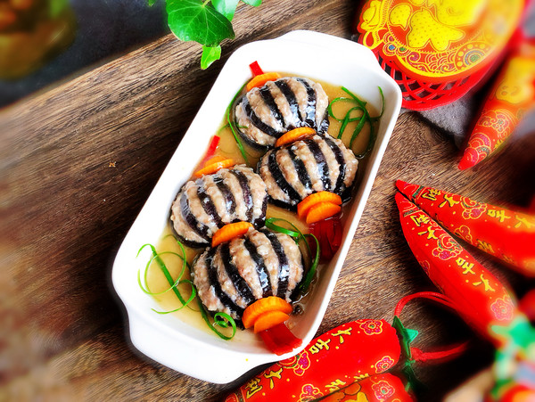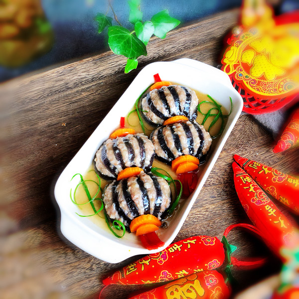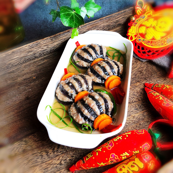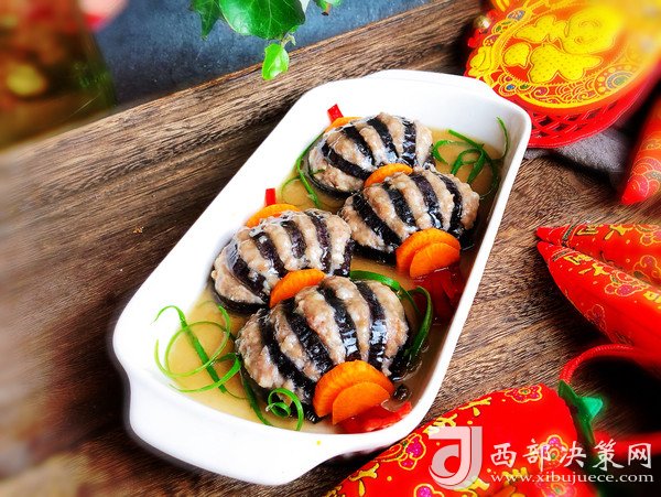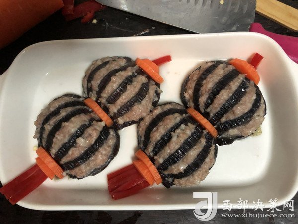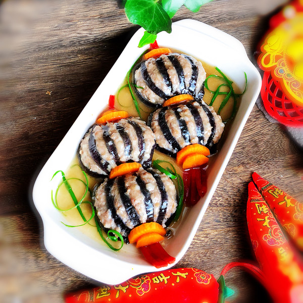 “今天買了一個(gè)大茄子,釀入豬肉餡,樣子像極了燈籠,如果你想顏色更深一點(diǎn),那就在調(diào)肉餡的時(shí)候加點(diǎn)老抽甚至加點(diǎn)紅曲粉,最后調(diào)澆汁的時(shí)候可以調(diào)成酸甜的番茄汁味,那就看起來更加的紅紅火火了。不過我還是比較喜歡這種小清新的風(fēng)格。這道菜一上桌,能把大魚大肉都比下去,好看好吃還喜慶。”